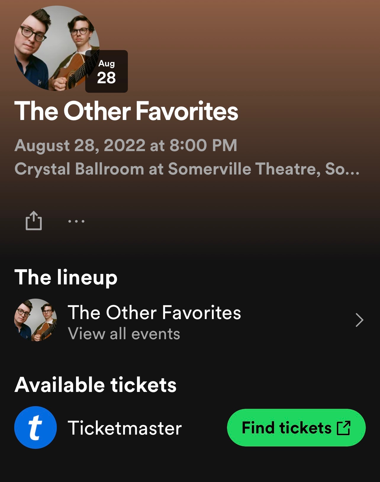 Spotify isn’t selling the tickets directly. Clicking on “Find tickets” in this example just brings you to Ticketmaster, where you still have to deal with, well, Ticketmaster.